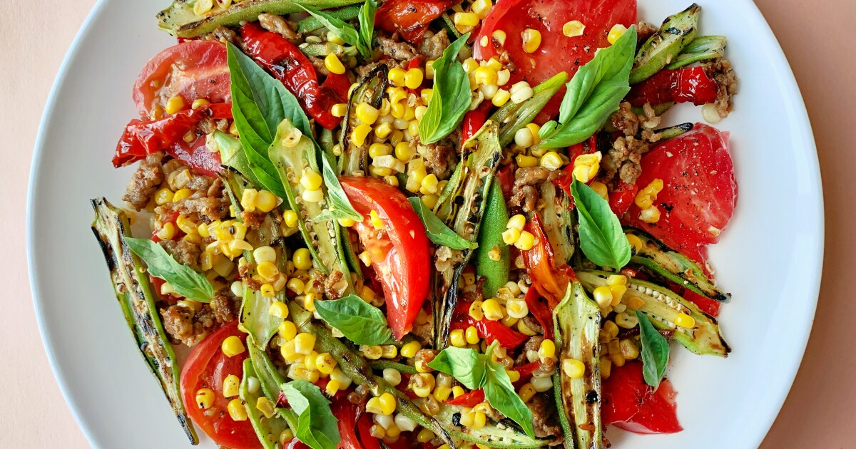 To transform them into dinner, I arrange thin wedges of those tomatoes on a platter and sprinkle them with sea salt and pepper to help draw out their moisture and season them deeply while I get on with cooking the rest of the ingredients. The okra, peppers and corn each get their turn in the skillet, stir-fried with a little olive oil until lightly blistered and tender. Some crisped spicy Italian sausage — full of chile heat and fennel seeds — adds meaty heft to the vegetables, while their rendered fat mingles with apple cider vinegar and minced garlic to tie the whole dish together.