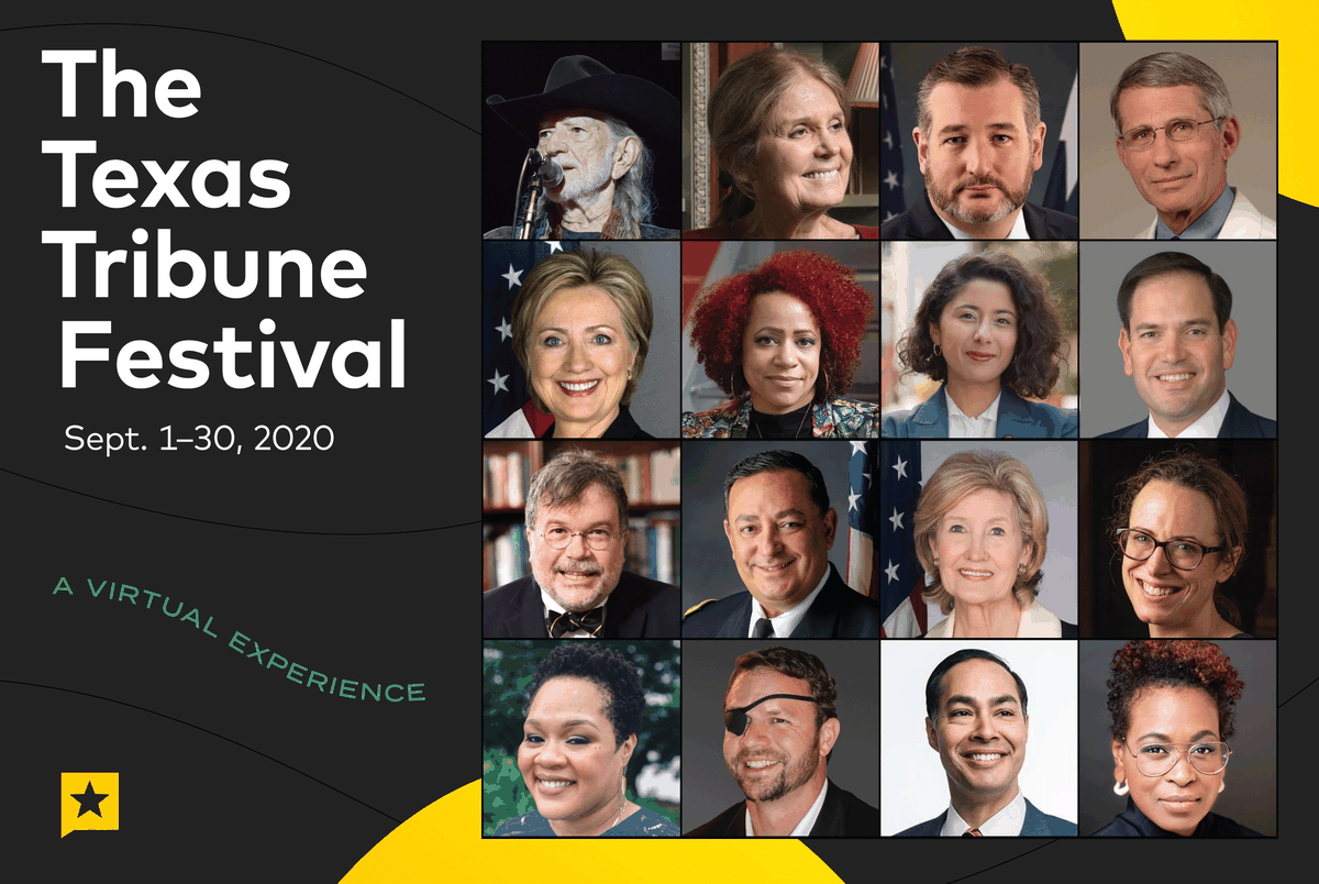 Back in June, we shared the general plan for virtual TribFest, the digital pivot from our signature in-person ideas weekend, made necessary by the coronavirus. We hinted at a month-long mix of live and pre-recorded programs, some free and some ticketed, some viewable one-time only and some on demand, mostly video but a good bit of audio — carefully curated interviews and panels, all streamed on your favorite device, exploring the impact of the year’s crises on this fall’s elections, next year’s legislative session, public and higher education, the economy, criminal justice, energy, and health care. The specific plan, we said, was a work in progress.