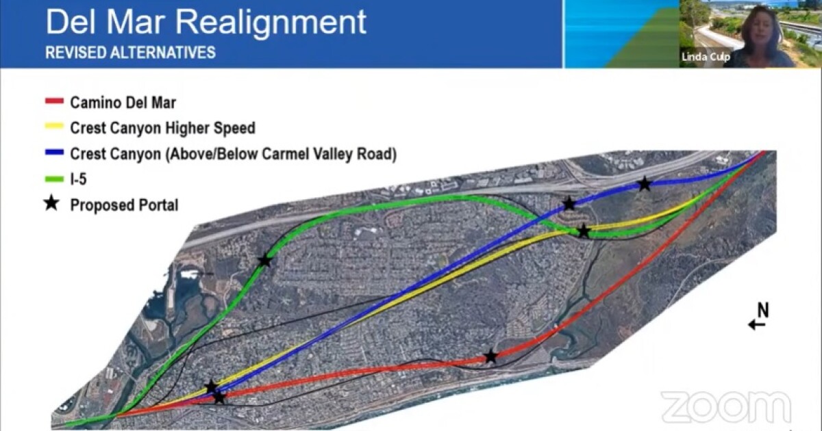The route along I-5 proved to be the longest, the costliest, with the slowest travel times, and as a result it is unlikely to be studied further, Culp said. Instead, the remaining conceptual studies will focus on the so-called “higher speed” Crest Canyon tunnel and the Camino Del Mar alignment.