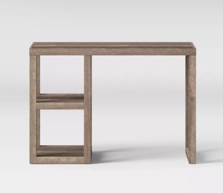 This wood desk has a 4.4-star average rating from more than 200 buyers on Target. The desk requires minimal assembly and is designed to fit in compact spaces. It can hold up to 100 pounds and features two storage and display compartments. It comes in white, espresso and rustic finishes.